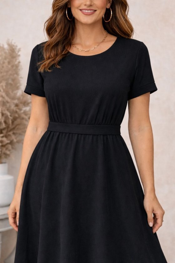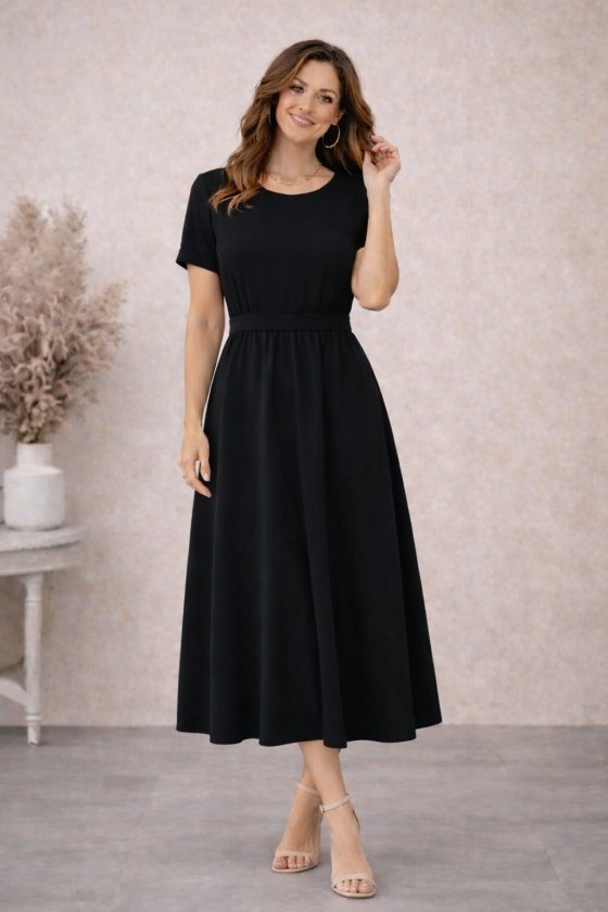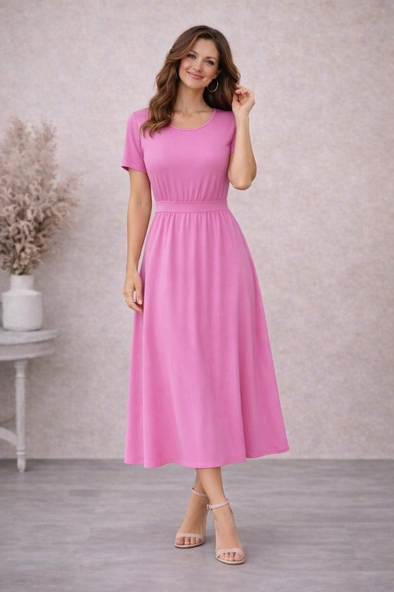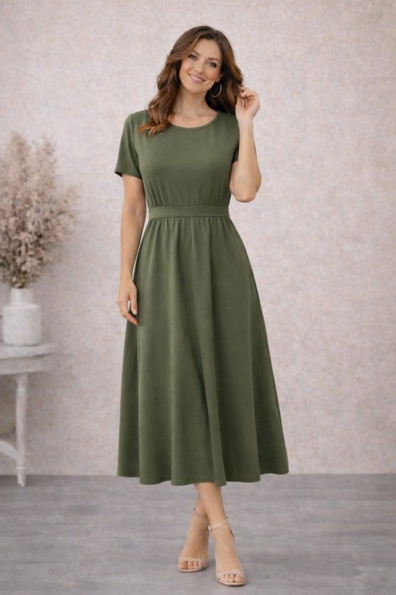 Kadın Kısa Kollu Yuvarlak Yaka Arkadan Düğmeli Viskon Midi Elbise