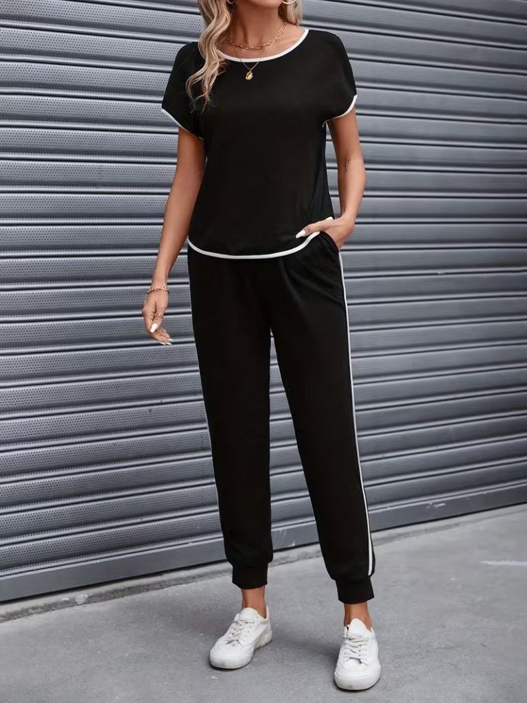 Kadın Kısa Kollu Yuvarlak Yakalı şerit Detaylı Viskon Iki Iplik Bluz Ve Pantolon Ikili Takım
