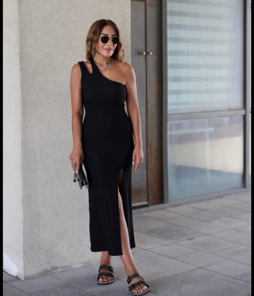 Kadın Omuz Askılı Derin Yırtmaç Detay Maxi Boy Elbise