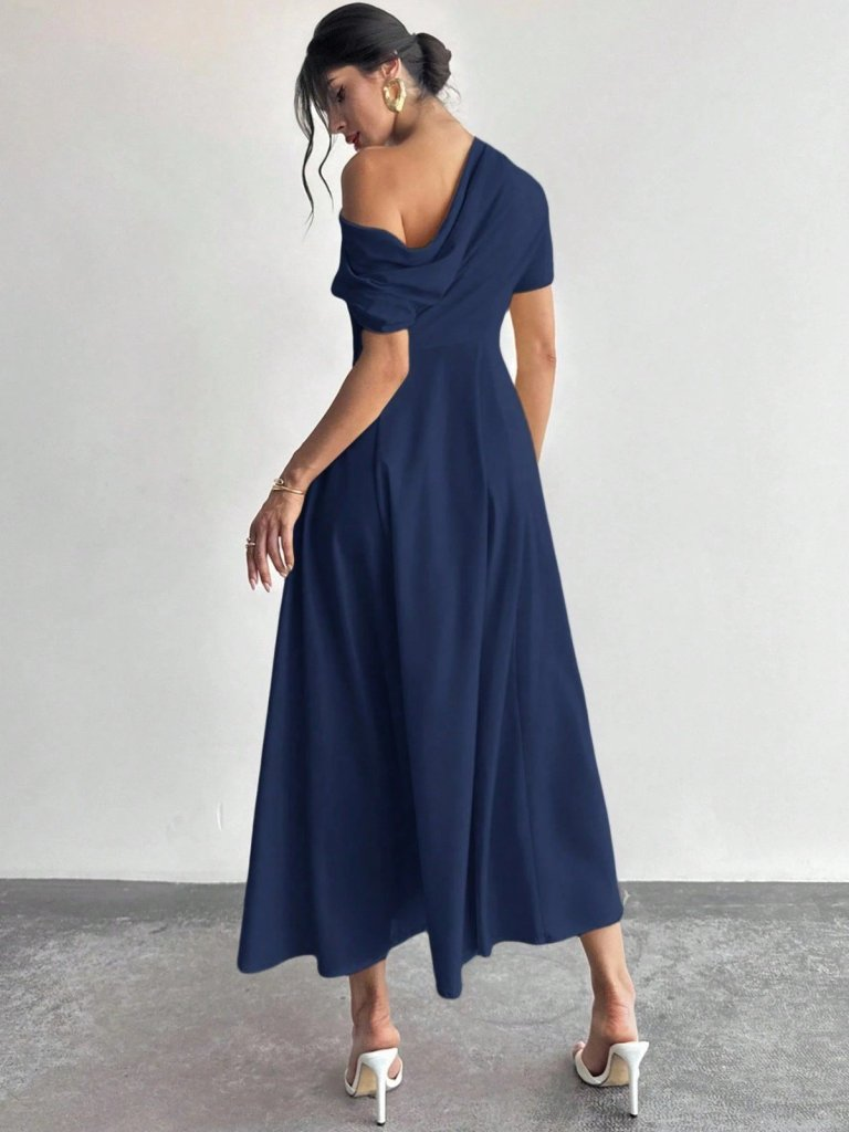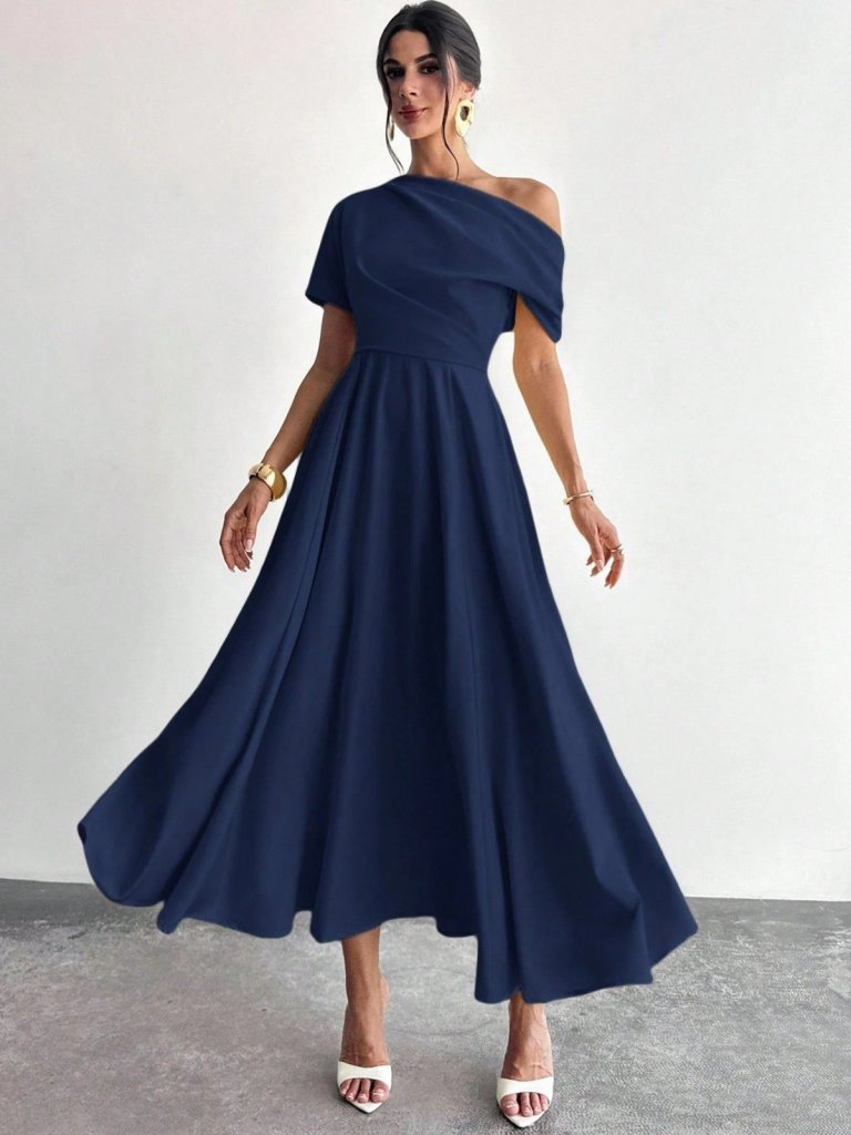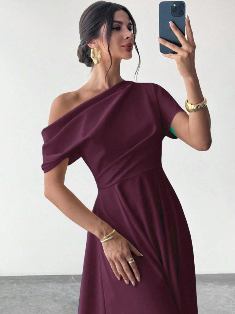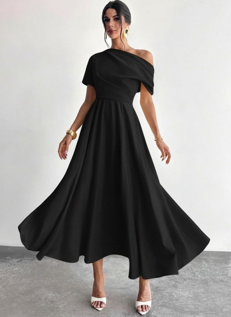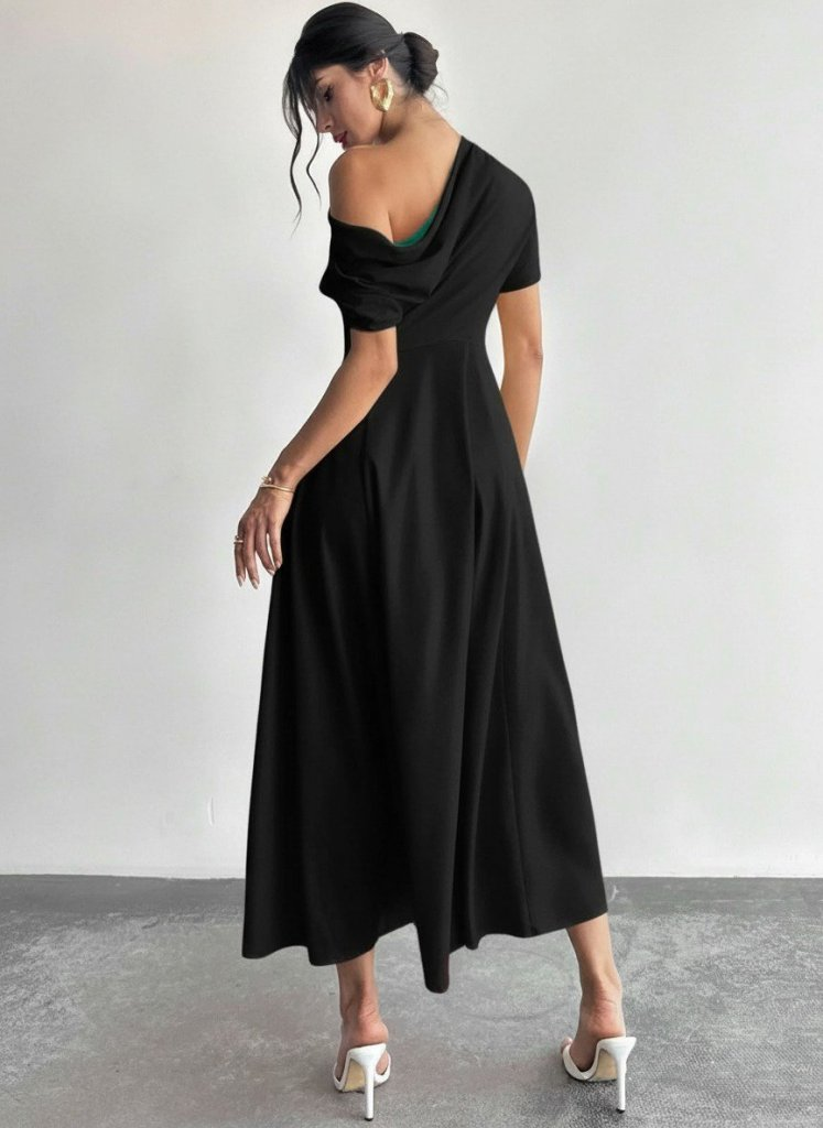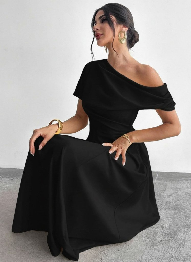 Kadın Omuzdan Açık Kısa Kollu Omuzdan Pileli Uzun Janjan Krep Elbise