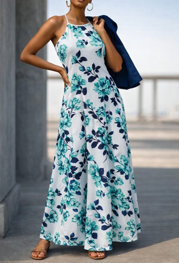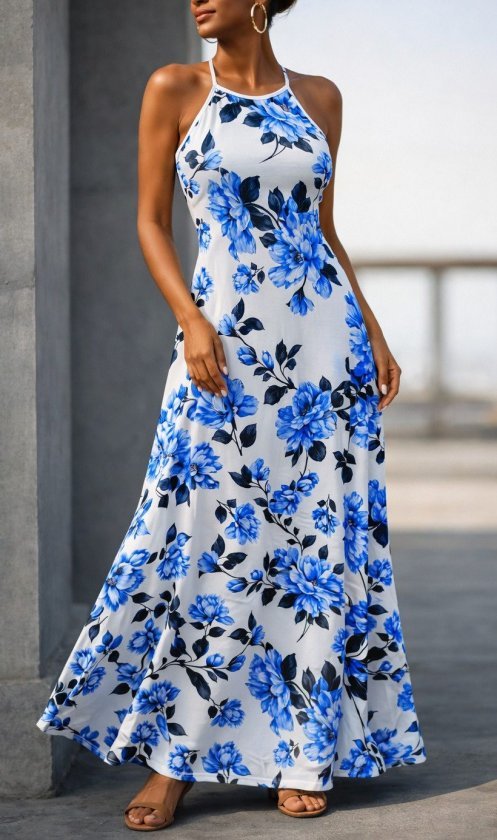 Kadın Omuzlardan Açık Ip Askılı Desenli Uzun Süprem Elbise