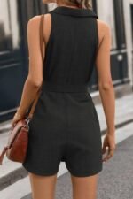 Kadın Sıfır Kollu Yakalı Düğmeli Belden Kuşaklı Kısa Keten Tulum