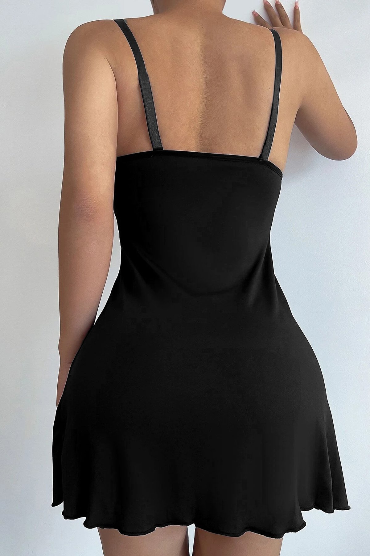 Kadın Siyah Askılı Beli Dantelli Göğsü Fiyonklu Şık Gecelik