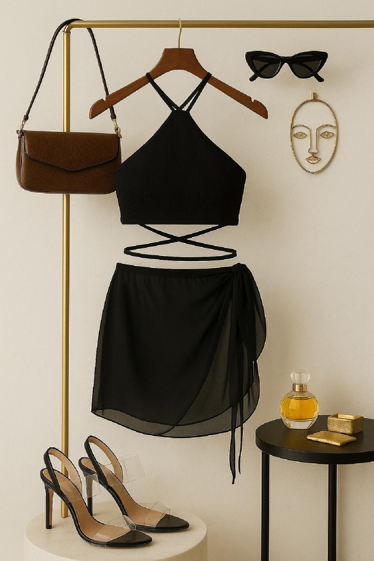 Kadın Siyah Çapraz Bağlamalı Crop ve Pareo 2’li Set
