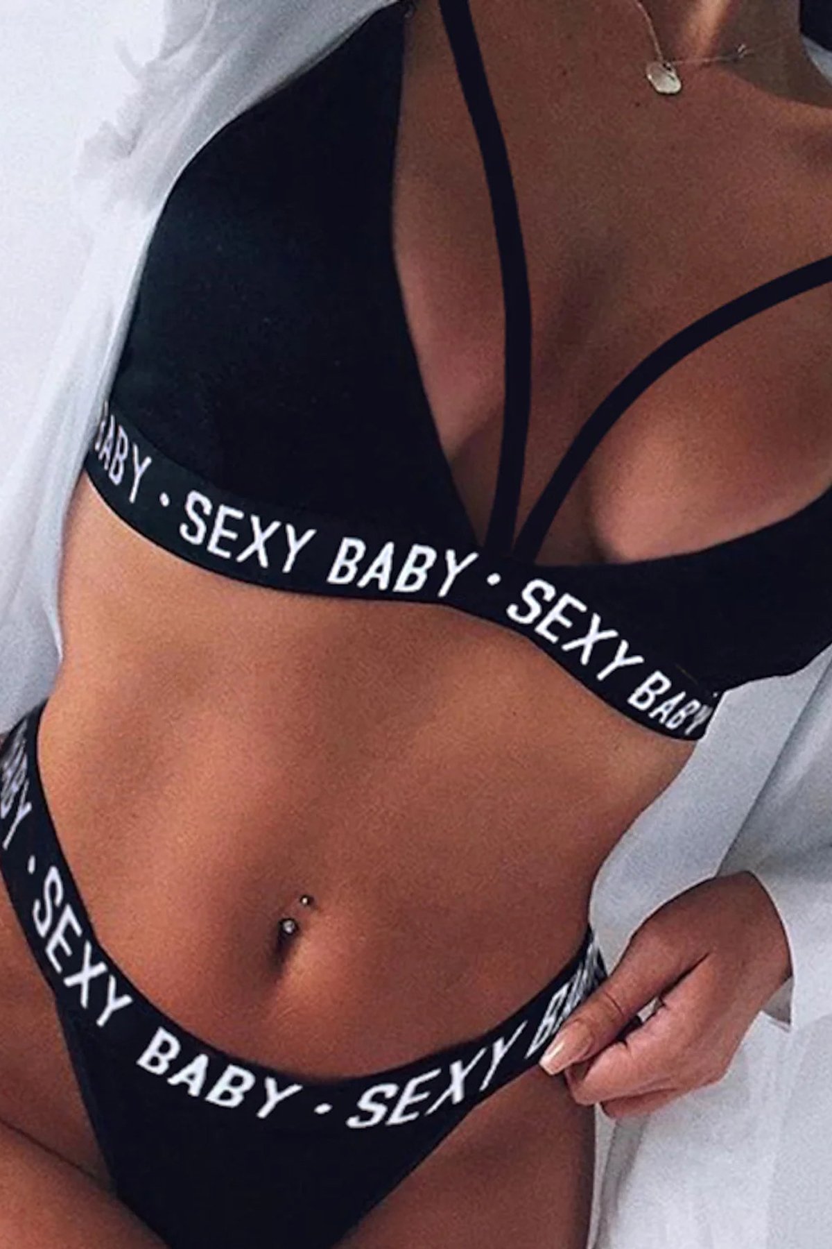 Kadın Siyah Yazı Detaylı Ipli Sütyen Takımı