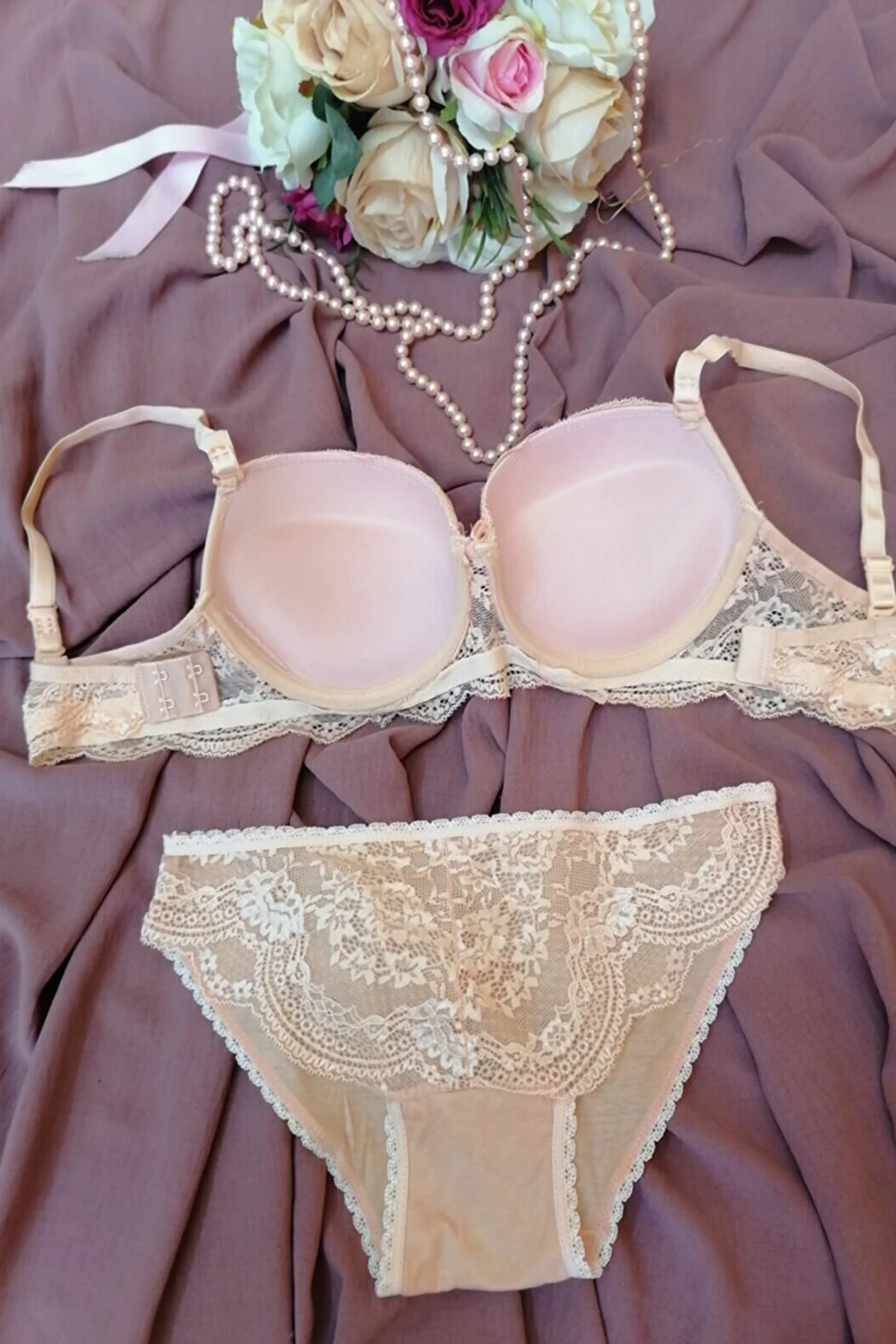 Kadın Somon Rengi Dolgulu Dantel Sütyen Ve Külot Takım