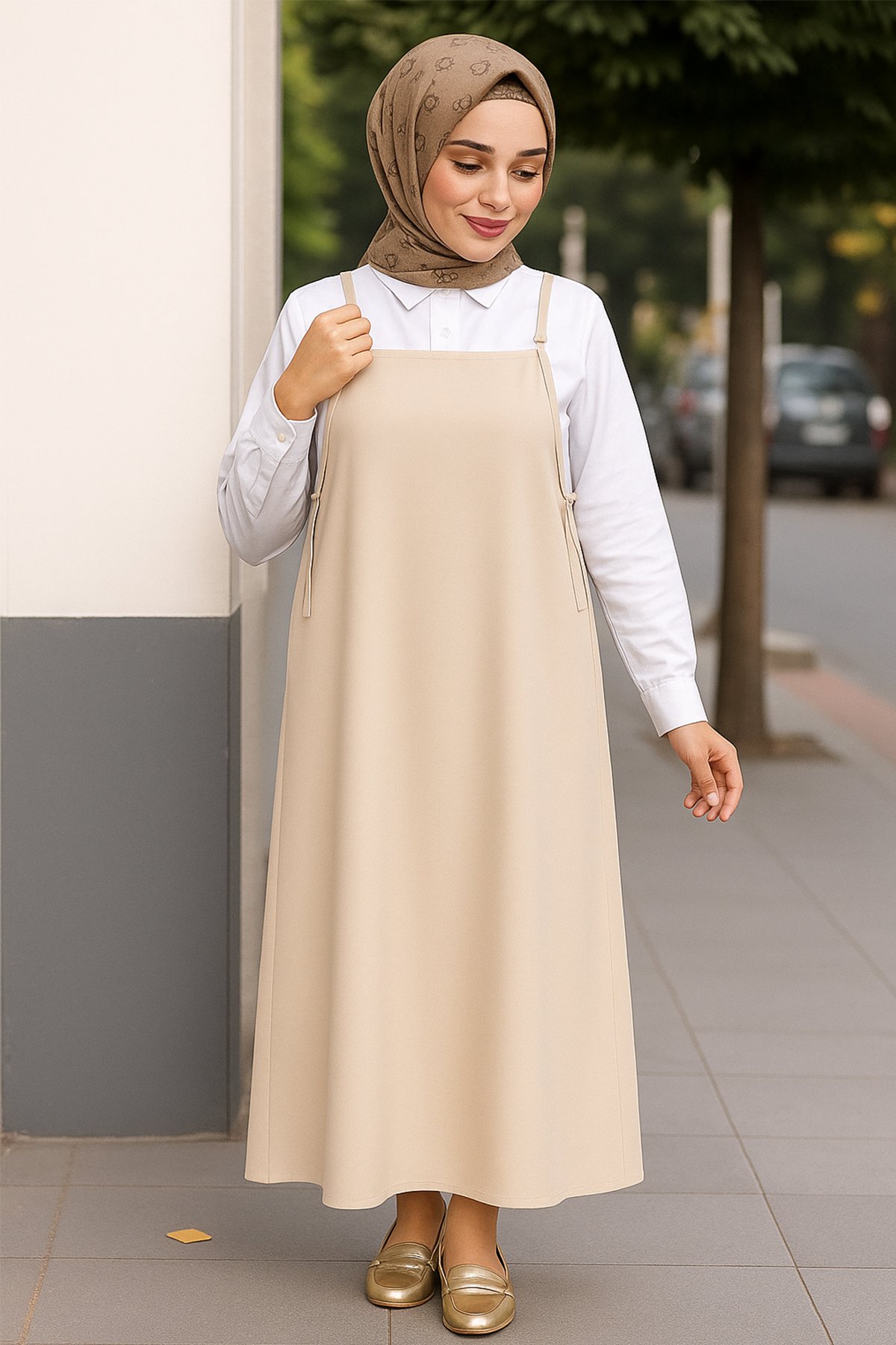 Kadın Taş Rengi Basic Ayarlanabilir Askılı Jile Elbise