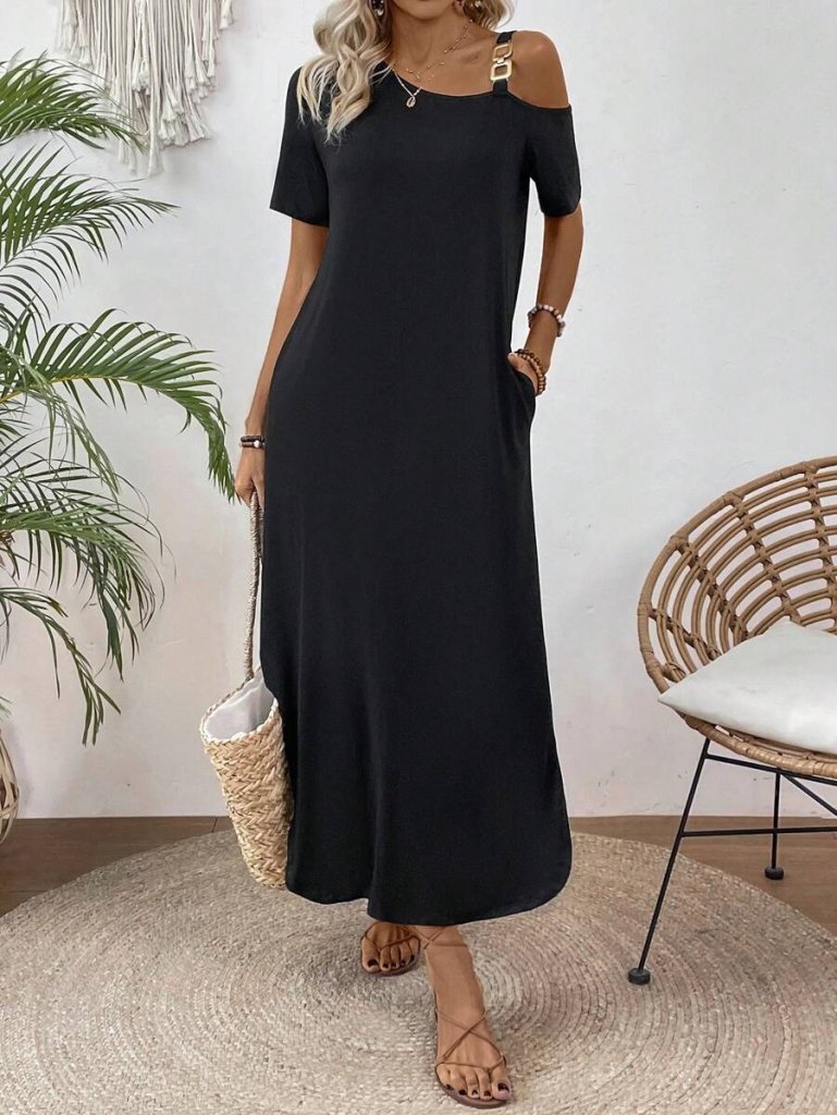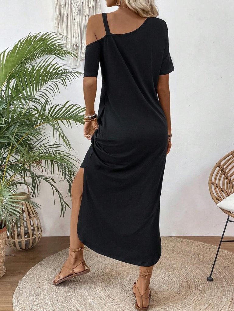 Kadın Tek Omuzdan Açık Toka Detaylı Yandan Yırtmaçlı Maksi Boy Viskon Elbise