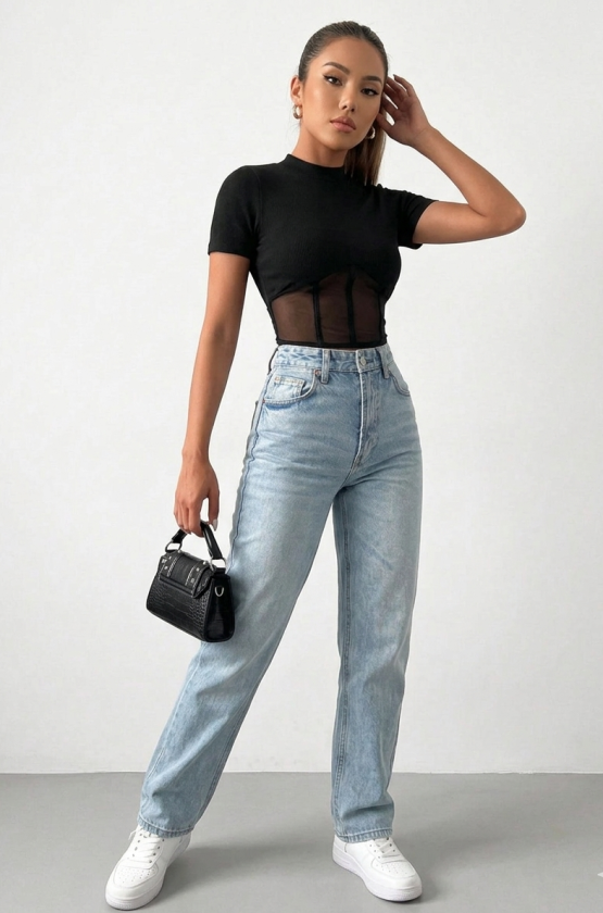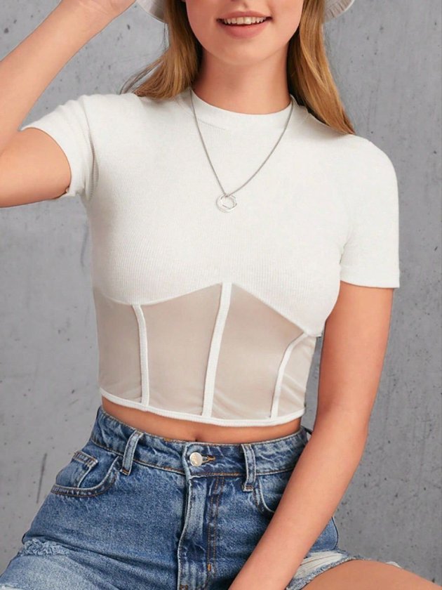 Kadın Transparan Detay Kısa Kol Kaşkorse Bluz