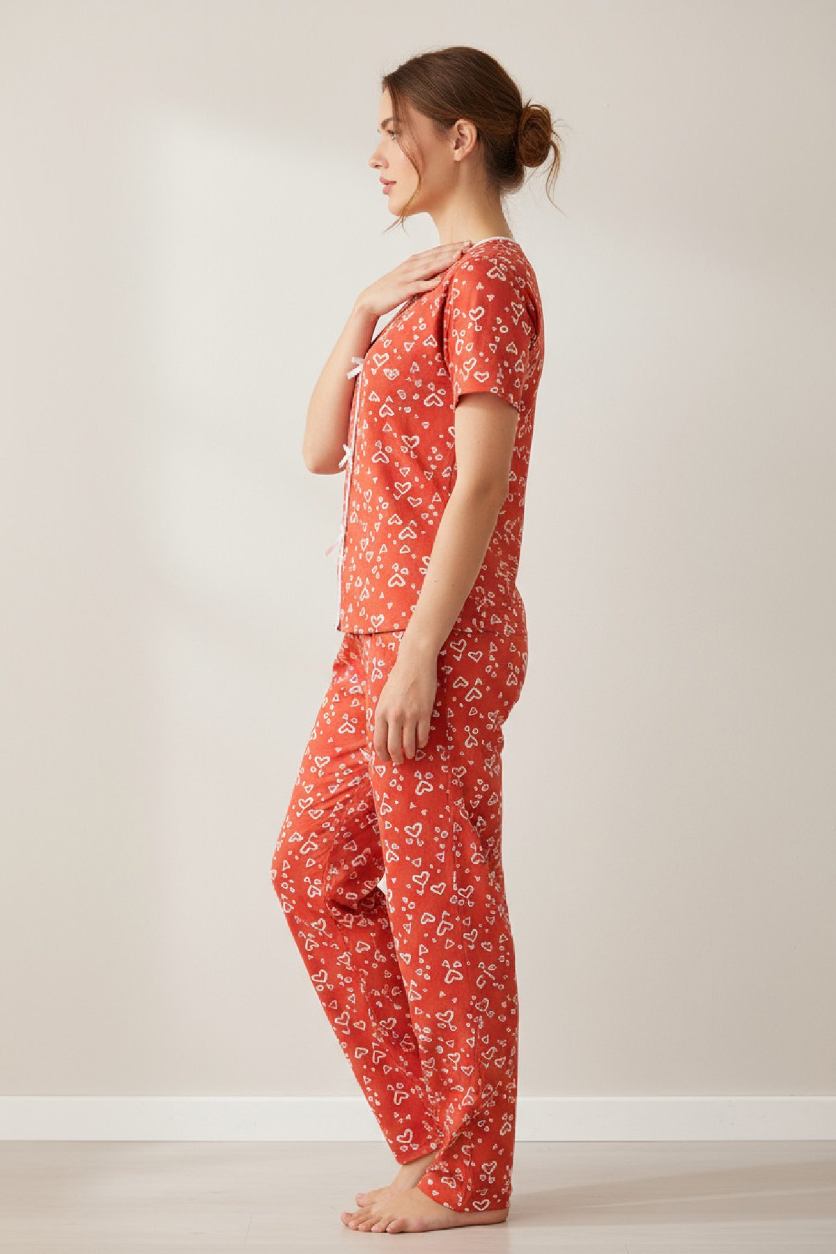 Kadın Turuncu Kalp Desenli Fiyonklu Kısa Kollu Uzun Pijama Takımı