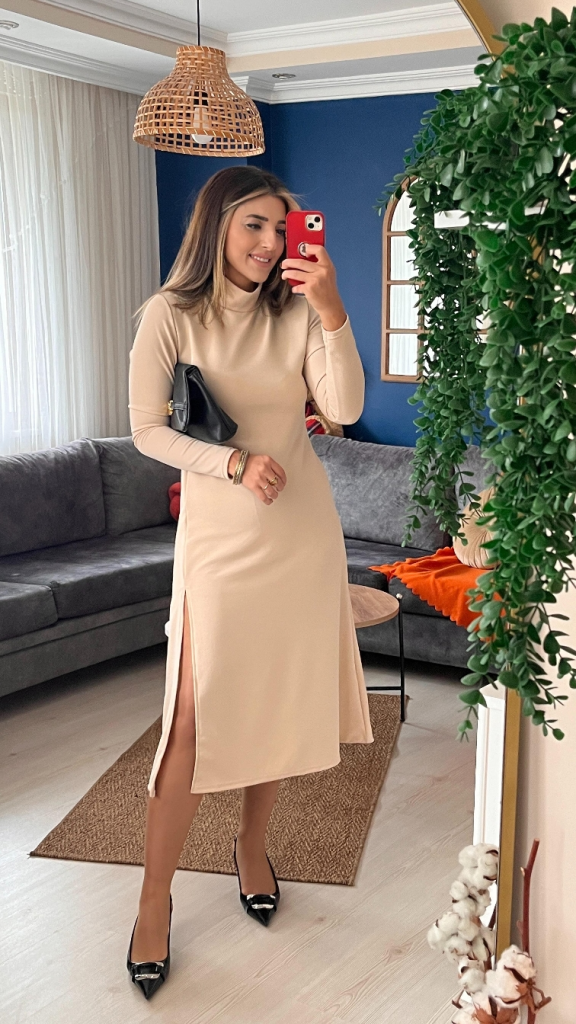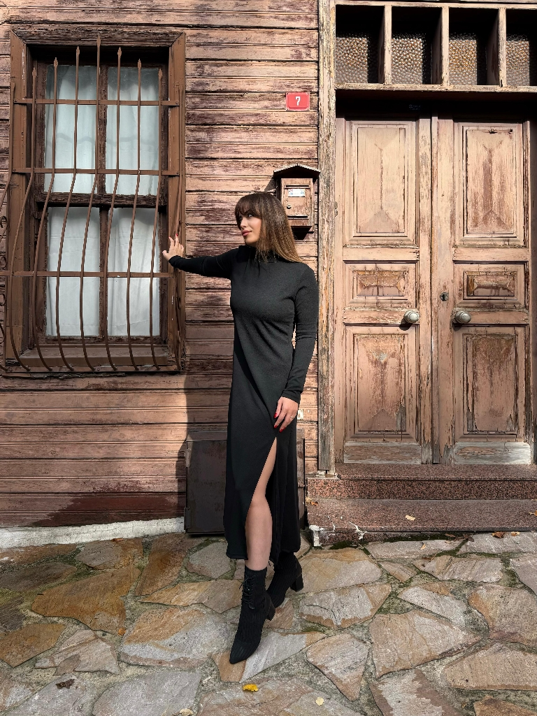 Kadın Uzun Kollu Balıkçı Yaka Derin Yırtmaç Detay Krep Elbise