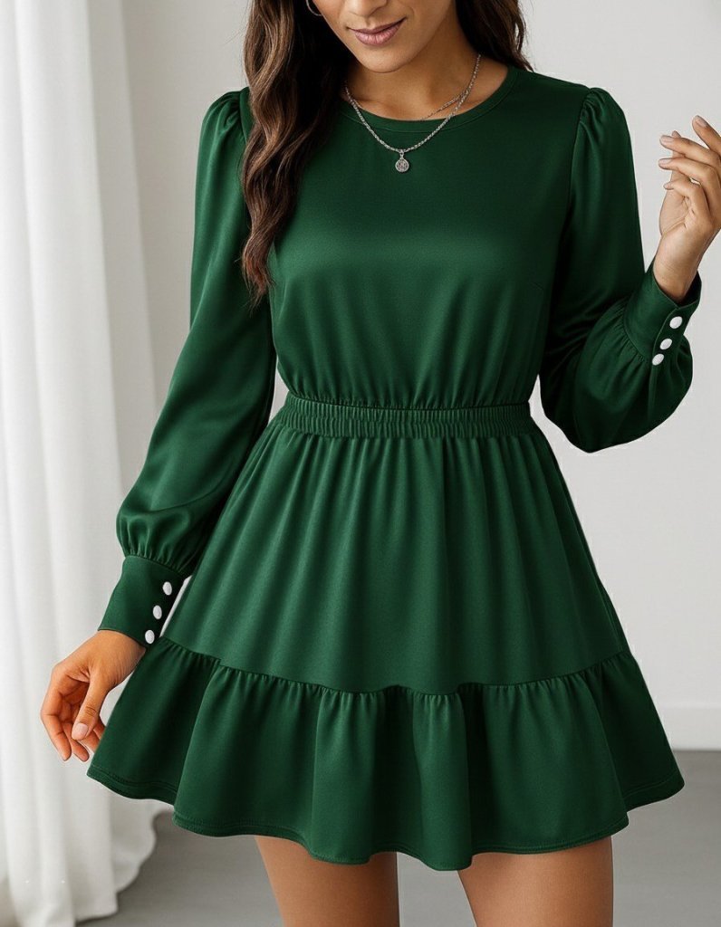 Kadın Uzun Kollu Bisiklet Yaka Beli Lastikli Fırfırlı Ithal Krep Elbise