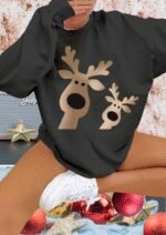 Kadın Uzun Kollu Bisiklet Yaka Geyik Desenli Viskon Iki Iplik Bluz