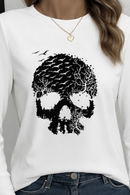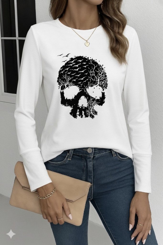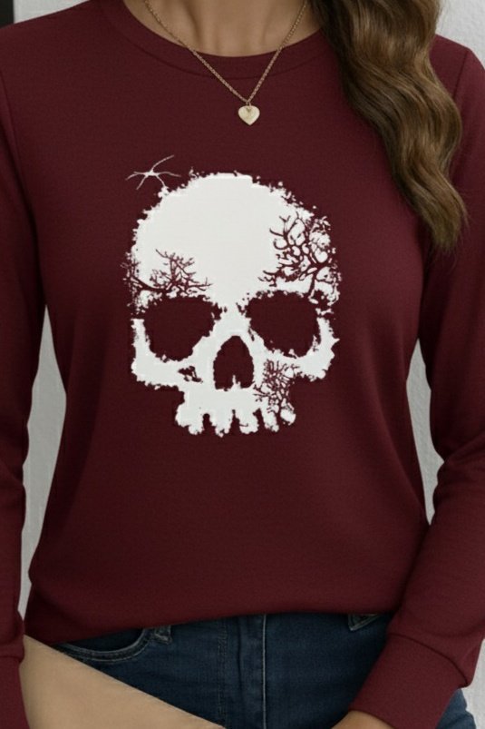 Kadın Uzun Kollu Bisiklet Yaka Kurukafa Desenli Viskon Bluz