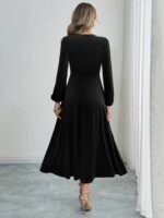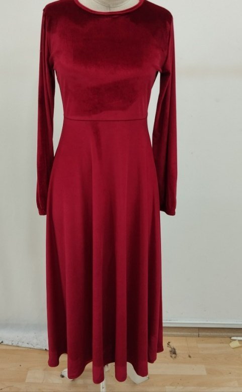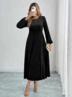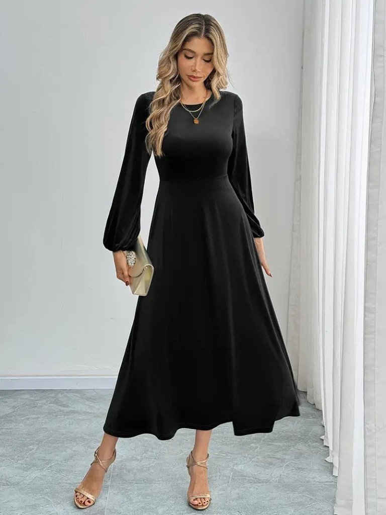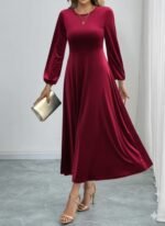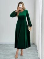 Kadın Uzun Kollu Bisiklet Yaka Midi Kadife Elbise