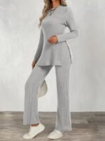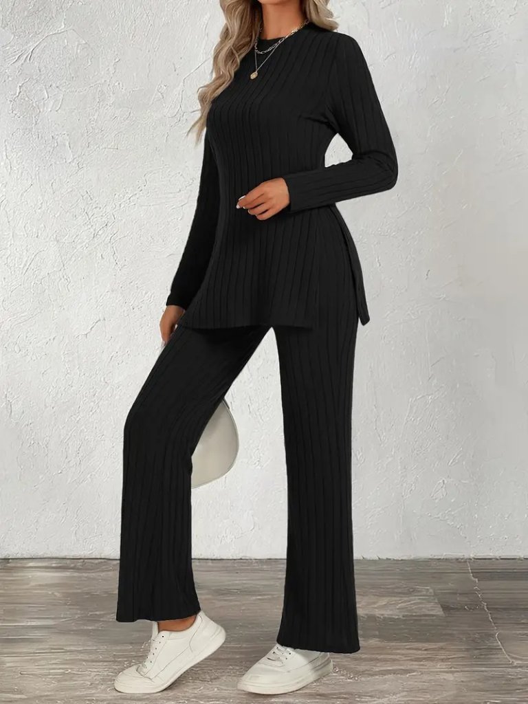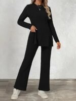 Kadın Uzun Kollu Bisiklet Yaka Yandan Yırtmaçlı şardonlu Kaşkorse Bluz Ve Pantolon Ikili Takım