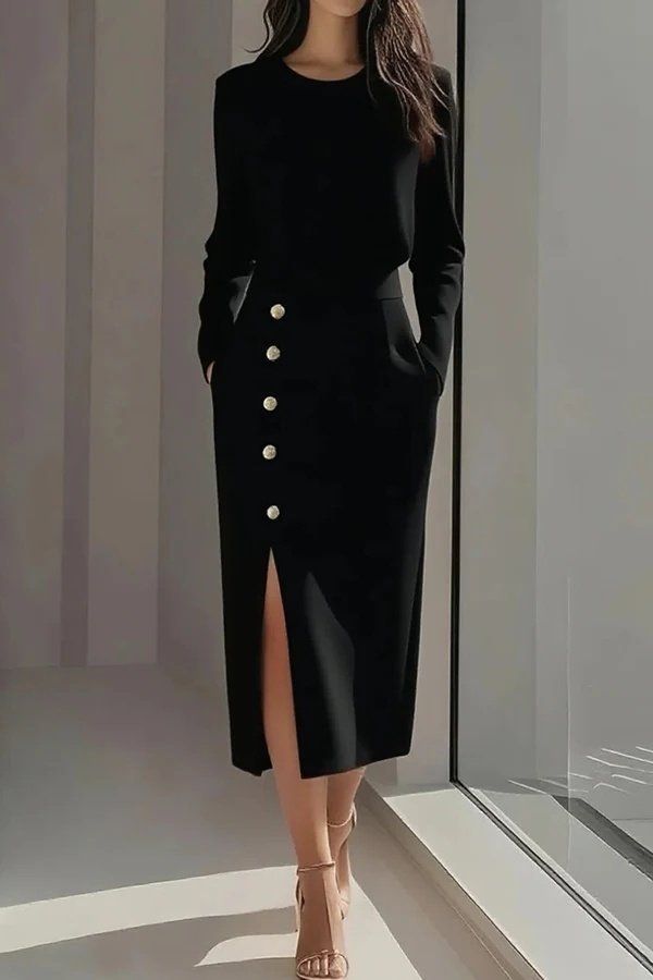 Kadın Uzun Kollu Bisiklet Yakalı Yandan Yırtmaçlı Düğmeli Midi Ithal Krep Elbise