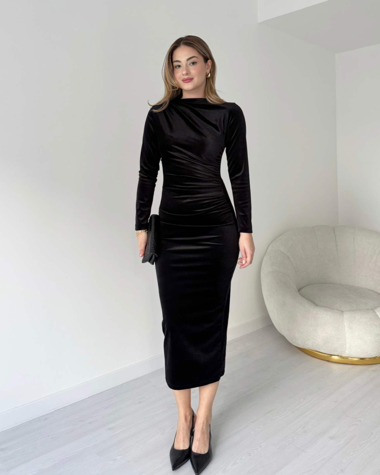 Kadın Uzun Kollu Büzgü Detay Kadife Kumaş Midi Boy Elbise
