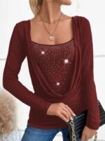 Kadın Uzun Kollu Derin Degaje Yakalı Taşlı Sandy Bluz