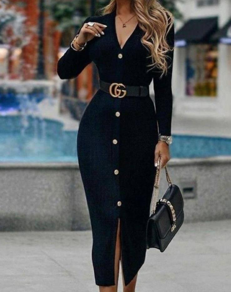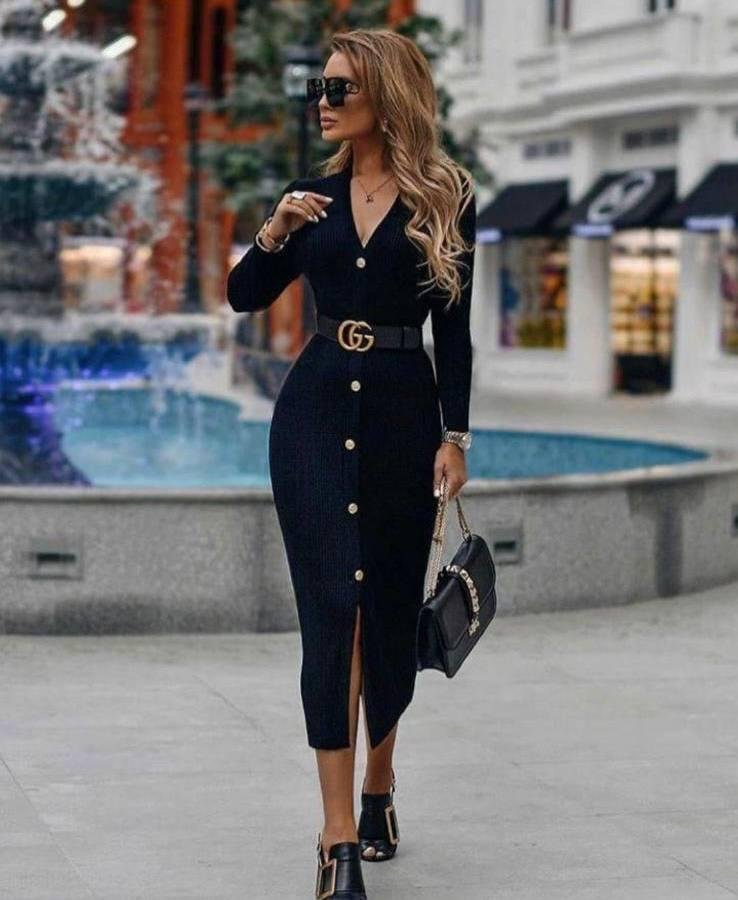 Kadın Uzun Kollu Düğme Detay örme Kaşkorse Kumaş Kemer Dahil Maxi Boy Elbise