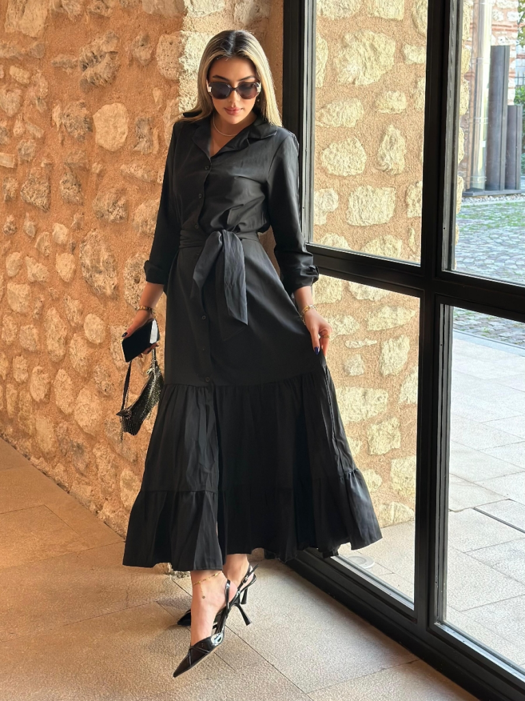Kadın Uzun Kollu Eteği Fırfırlı Beli Kuşaklı Trikoton Tam Boy Gömlek Elbise