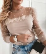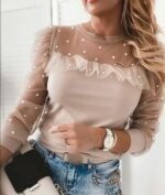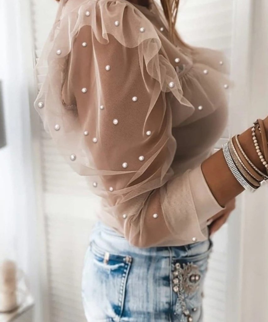 Kadın Uzun Kollu Inci Detaylı Tüllü Viskon Bluz