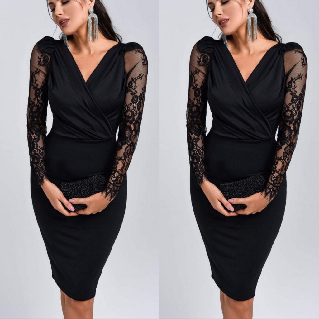 Kadın Uzun Kollu Kruvaze Yaka Kollar Tül Detay Ithal Krep Mini Boy Elbise