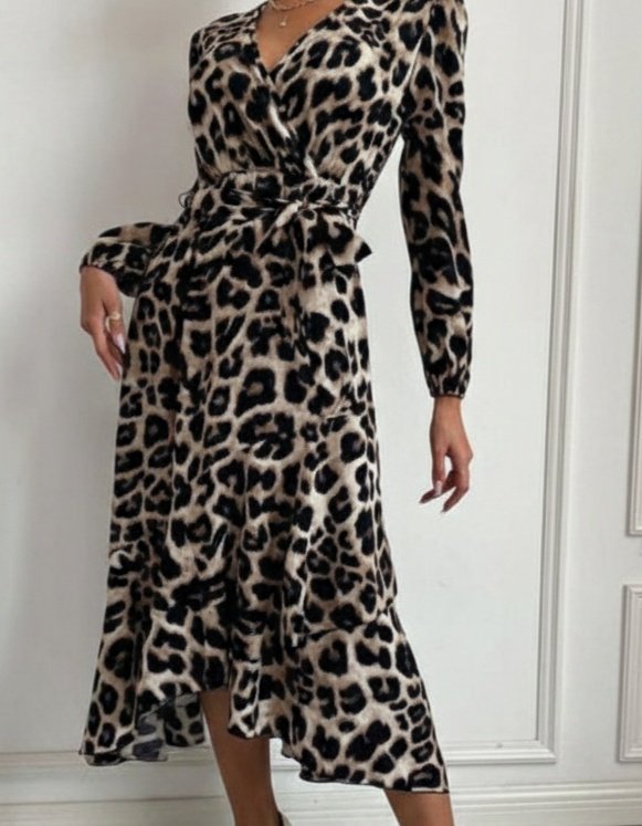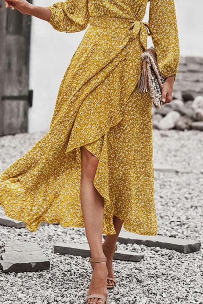 Kadın Uzun Kollu Kruvaze Yaka Yandan Bağlamalı önden Fırfır Detaylı Süprem Uzun Elbise