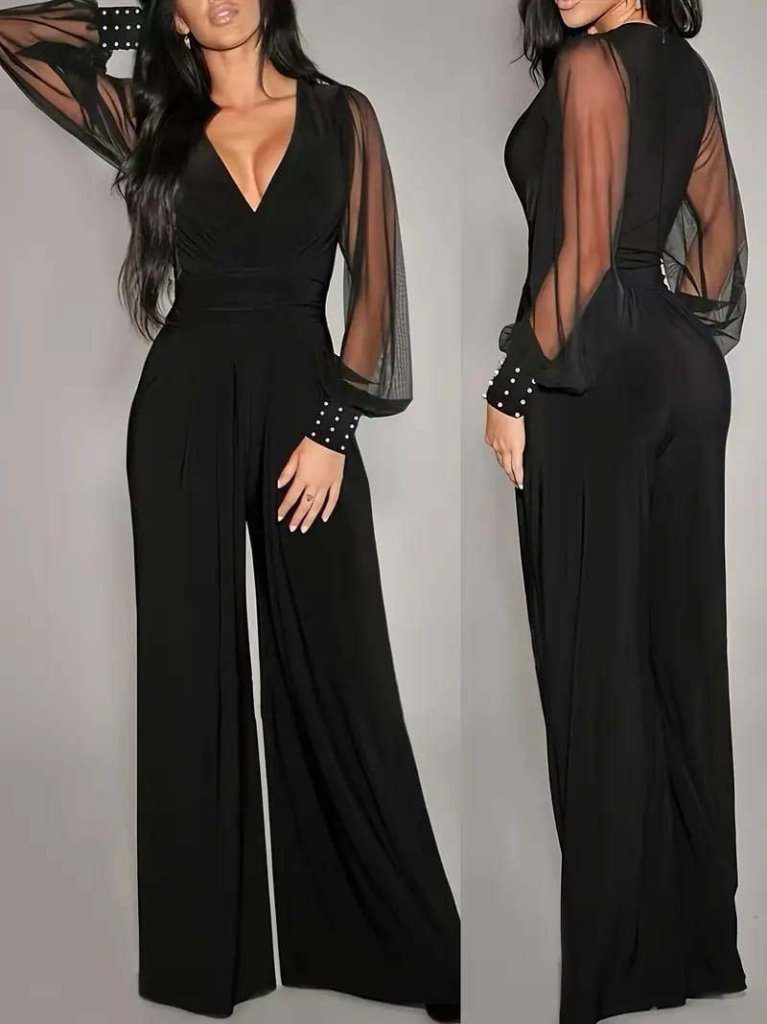 Kadın Uzun Kollu Kruvaze Yakalı Kolları Tüllü Viskon Tulum