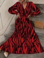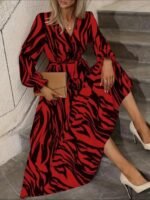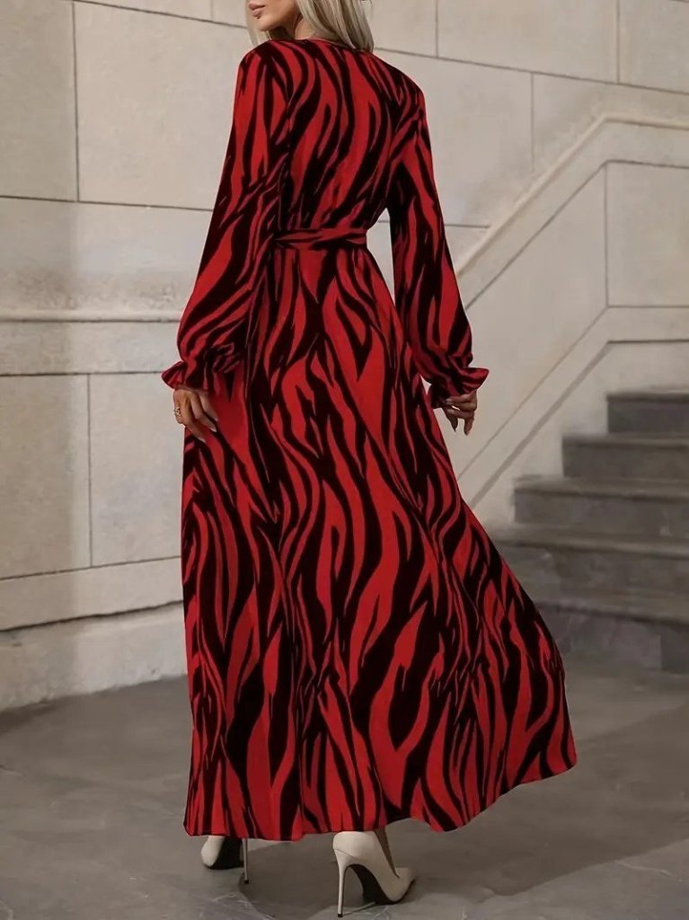 Kadın Uzun Kollu Kruvaze Yakalı Kuşaklı Zebra Desenli Süprem Maxi Elbise