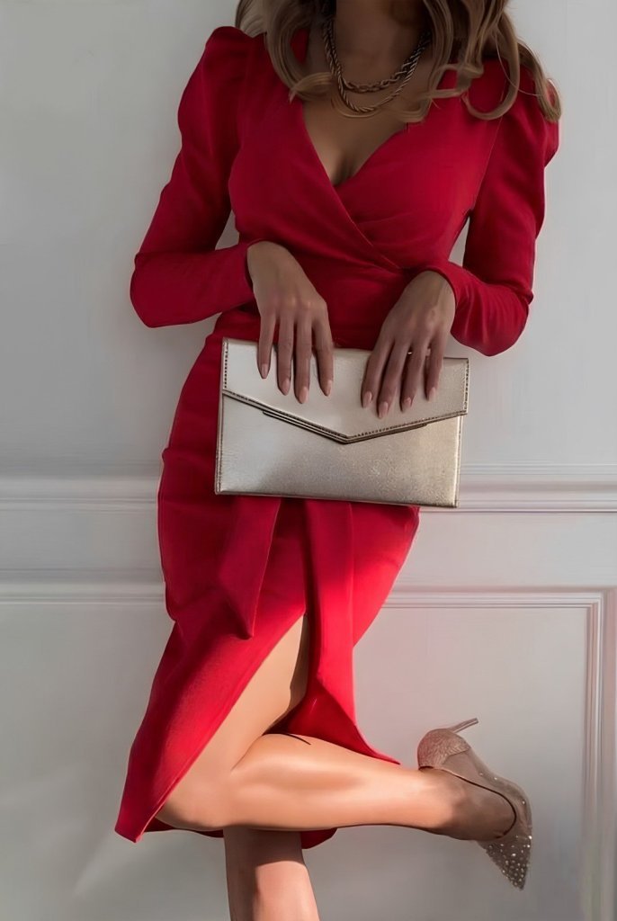 Kadın Uzun Kollu Kruvaze Yakalı Yandan Yırtmaçlı Belden Kuşaklı Midi Ithal Krep Elbise