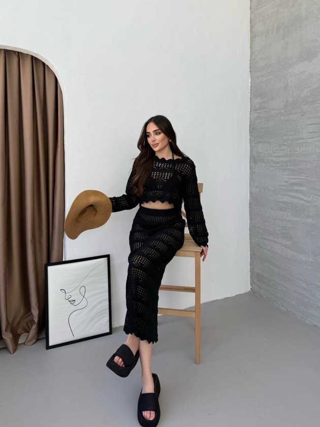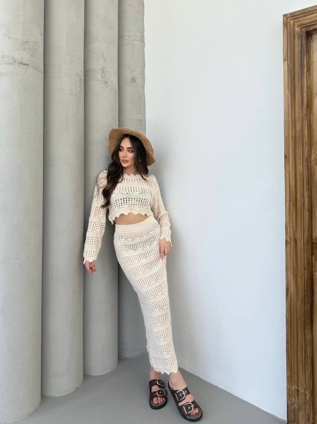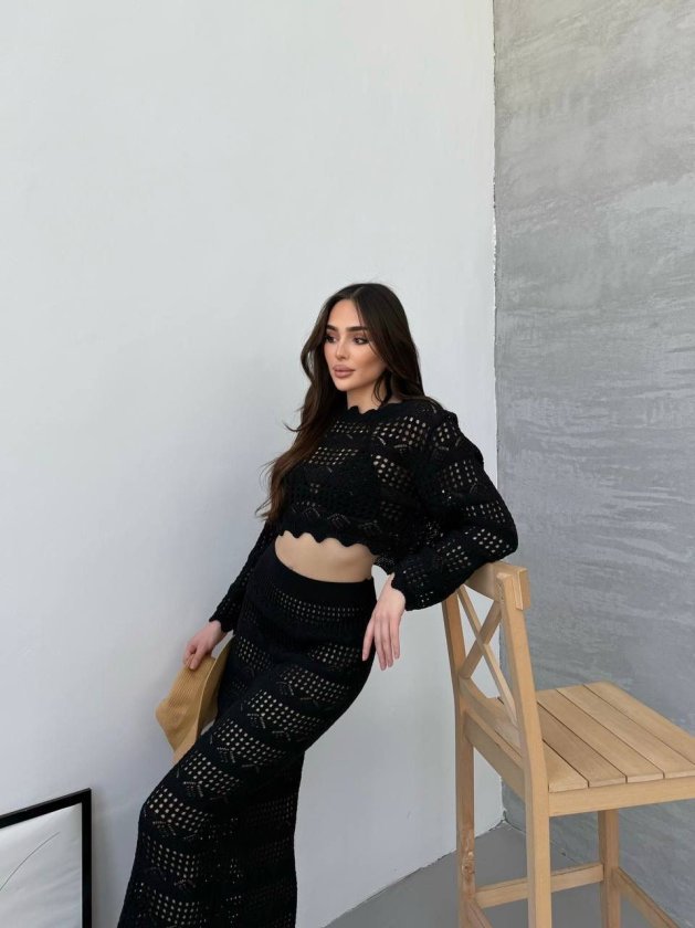 Kadın Uzun Kollu Kuş Gözü Transparan Detay Triko Bluz Ve Maxi Boy Etek Ikili Takım