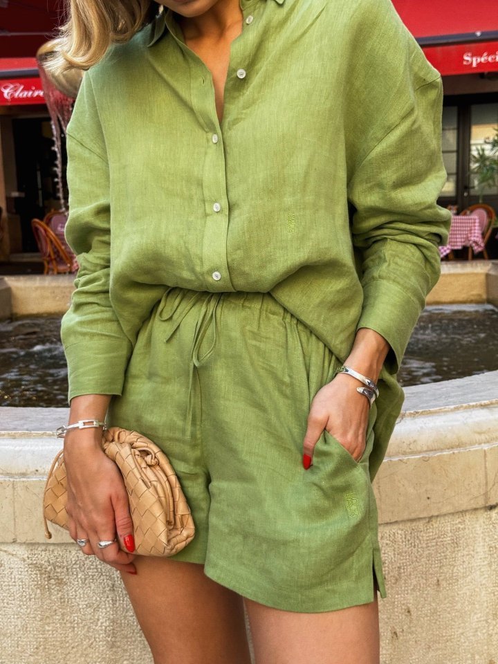 Kadın Uzun Kollu Salaş Gömlek Ve şort Keten Ikili Takım