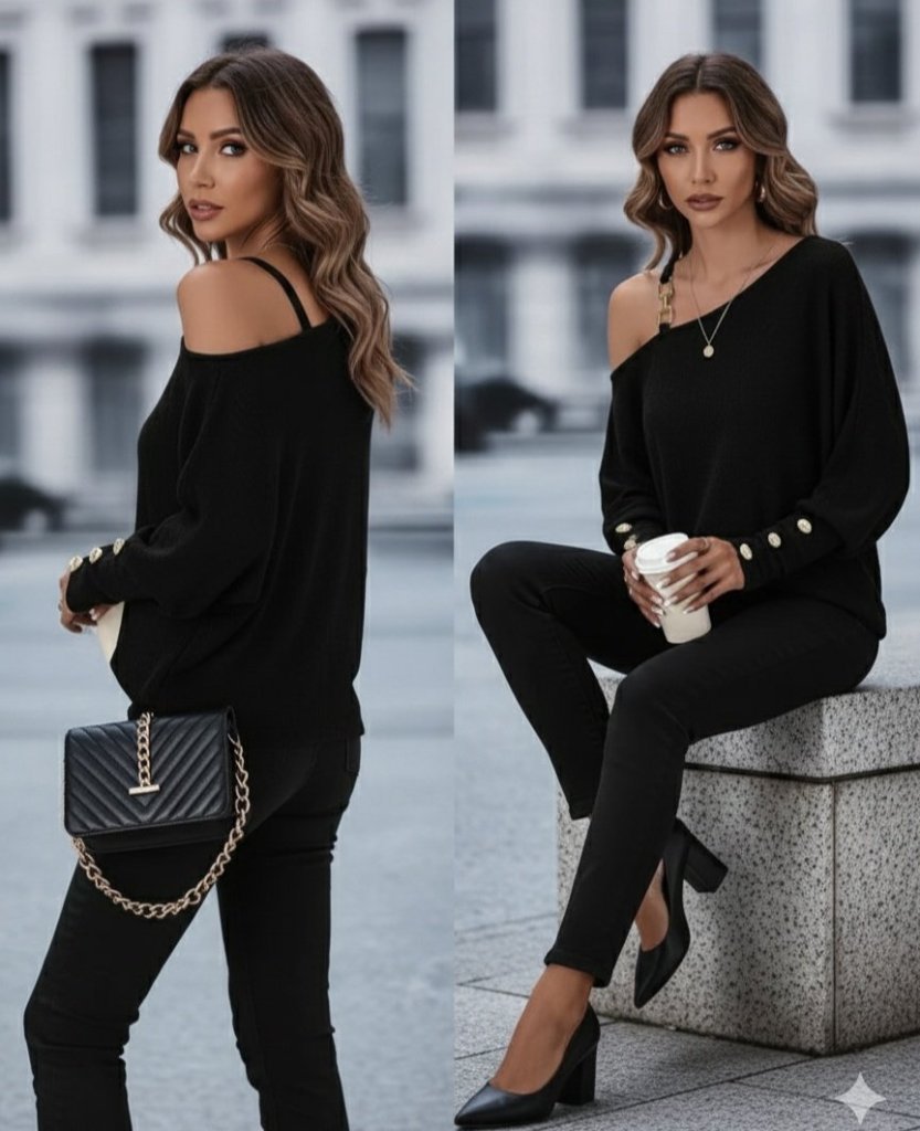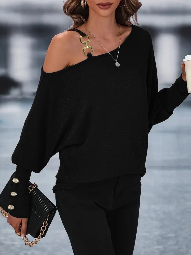 Kadın Uzun Kollu Tek Omuzdan Açık Askı Detaylı Waffle Bluz