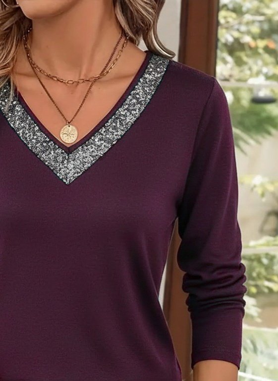 Kadın Uzun Kollu V Payet Yakalı Viskon Bluz