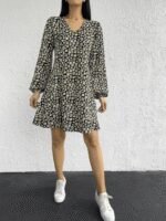 Kadın Uzun Kollu V Yaka çiçek Desenli Helen Kumaş Elbise