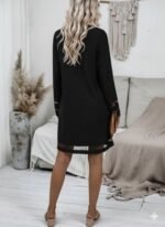 Kadın Uzun Kollu V Yakalı Tül şerit Detaylı Mini Krep Elbise