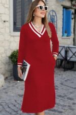 Kadın Uzun Kollu V Yakalı Yandan Yırtmaçlı Iki Iplik Midi Elbise