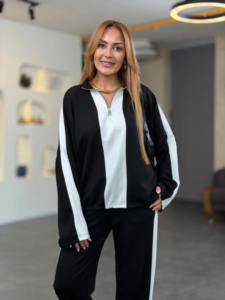 Kadın Uzun Kollu Yakadan Fermuarlı Viskon Iki Iplik Bluz Ve Pantolon Ikili Takım