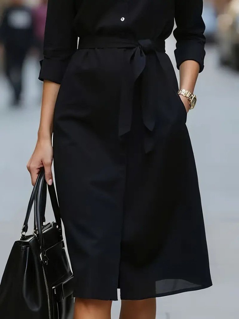 Kadın Uzun Kollu Yakalı Belden Kuşaklı Midi Trikoton Elbise