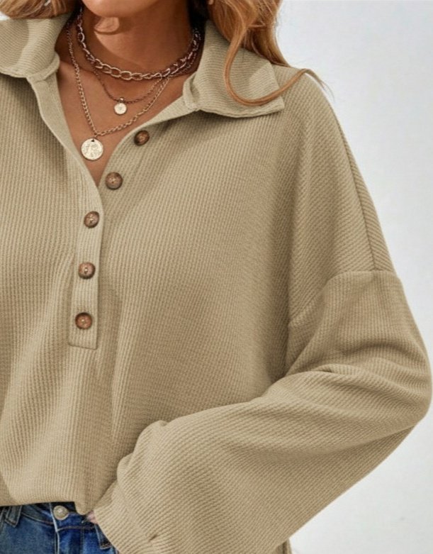 Kadın Uzun Kollu Yakalı Düğmeli Salaş Waffle Bluz