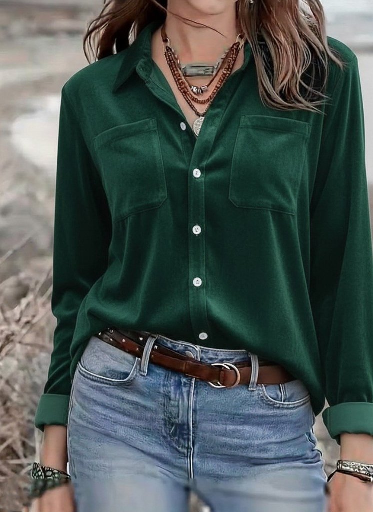 Kadın Uzun Kollu Yakalı önden Düğmeli Cep Detaylı Kadife Gömlek