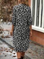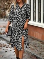 Kadın Uzun Kollu Yakalı önden Düğmeli Leopar Desenli Modal Midi Elbise