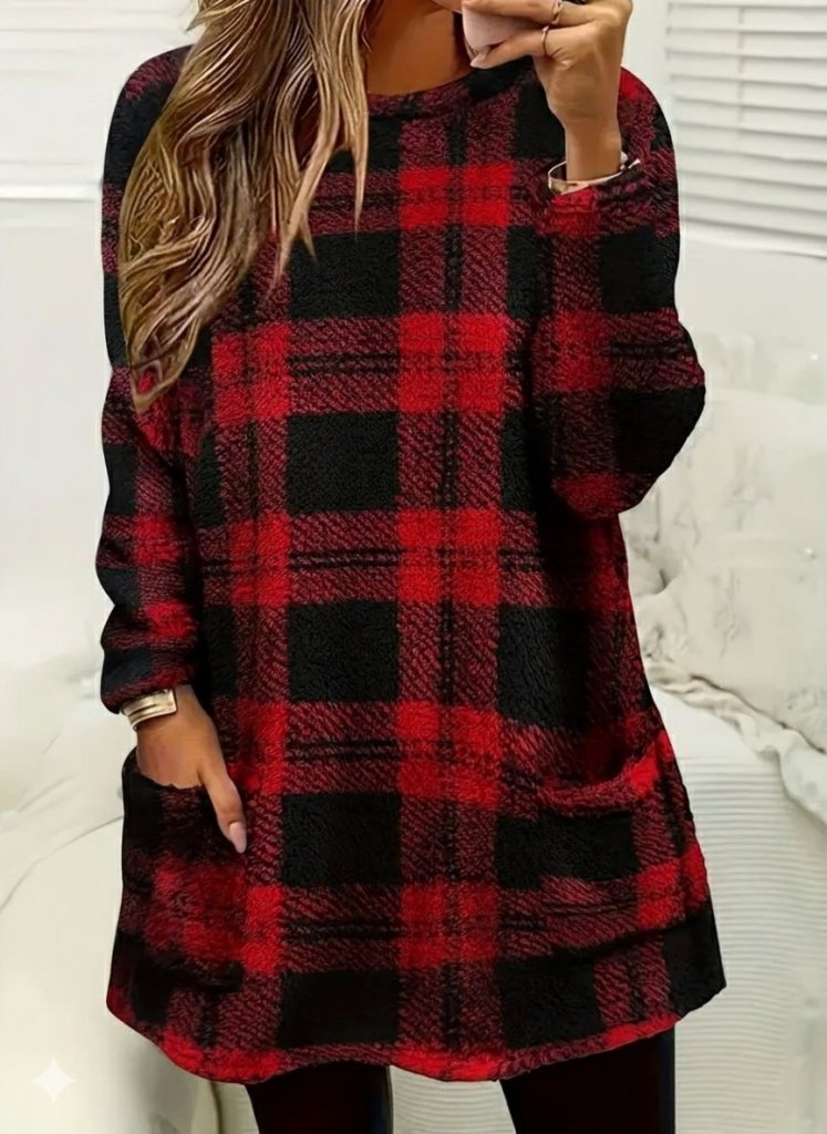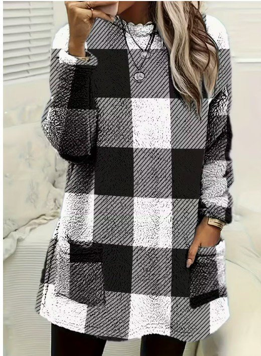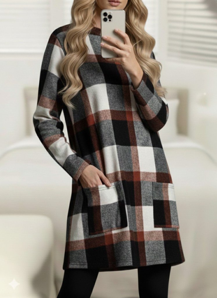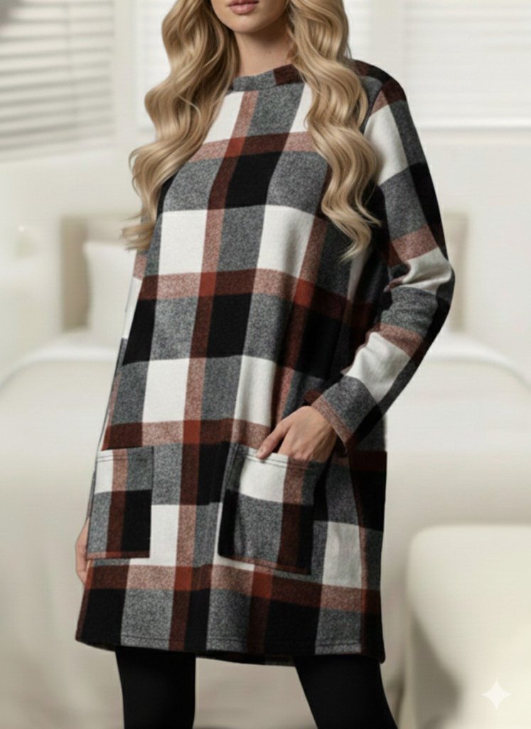 Kadın Uzun Kollu Yarı Balıkçı Yakalı Cep Detaylı Ekoseli Dokuma Tunik