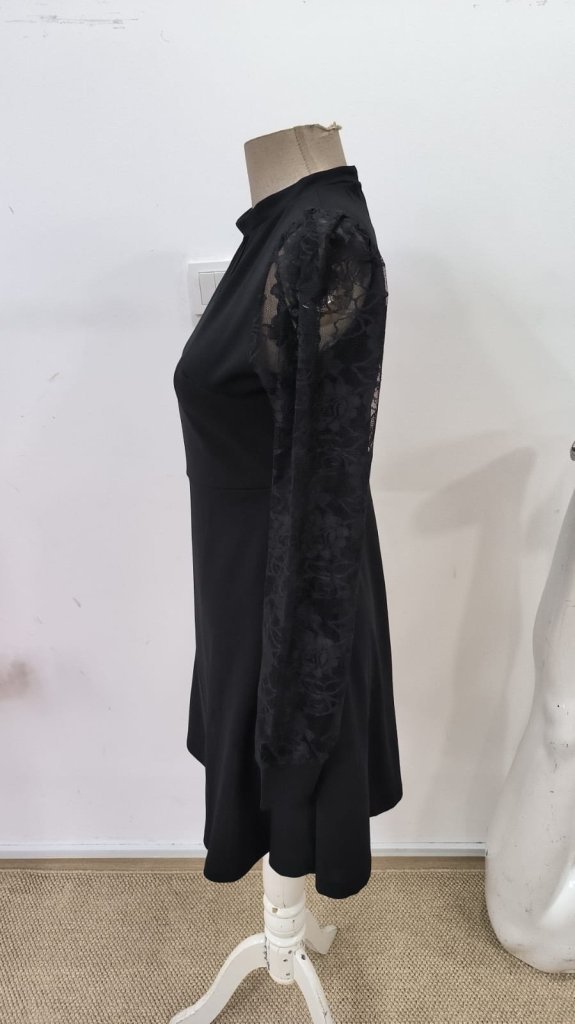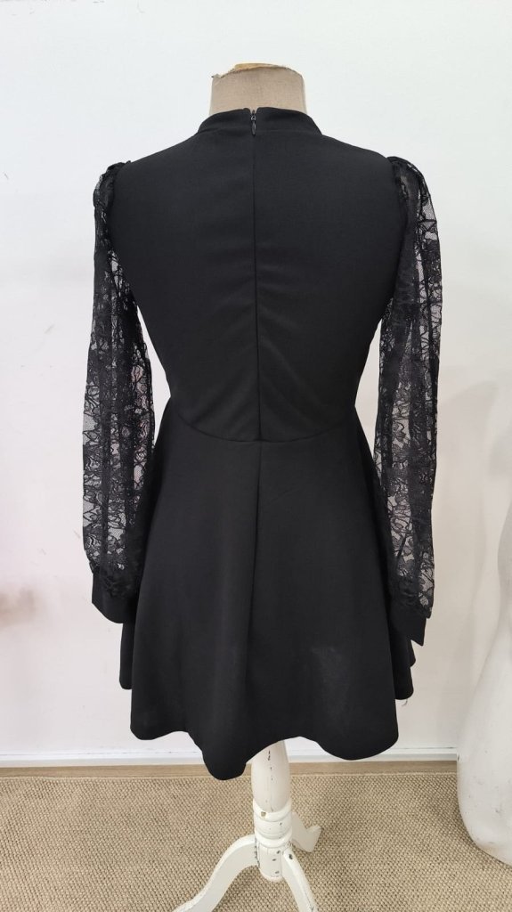 Kadın Uzun Kollu Yuvarlak Damla Detaylı Kolları Tül Detaylı Kısa Ithal Krep Elbise