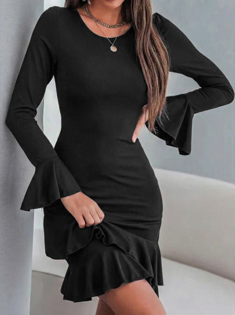 Kadın Uzun Kollu Yuvarlak Yaka Fırfırlı Kol Ucu Volanlı Janjan Krep Mini Elbise