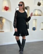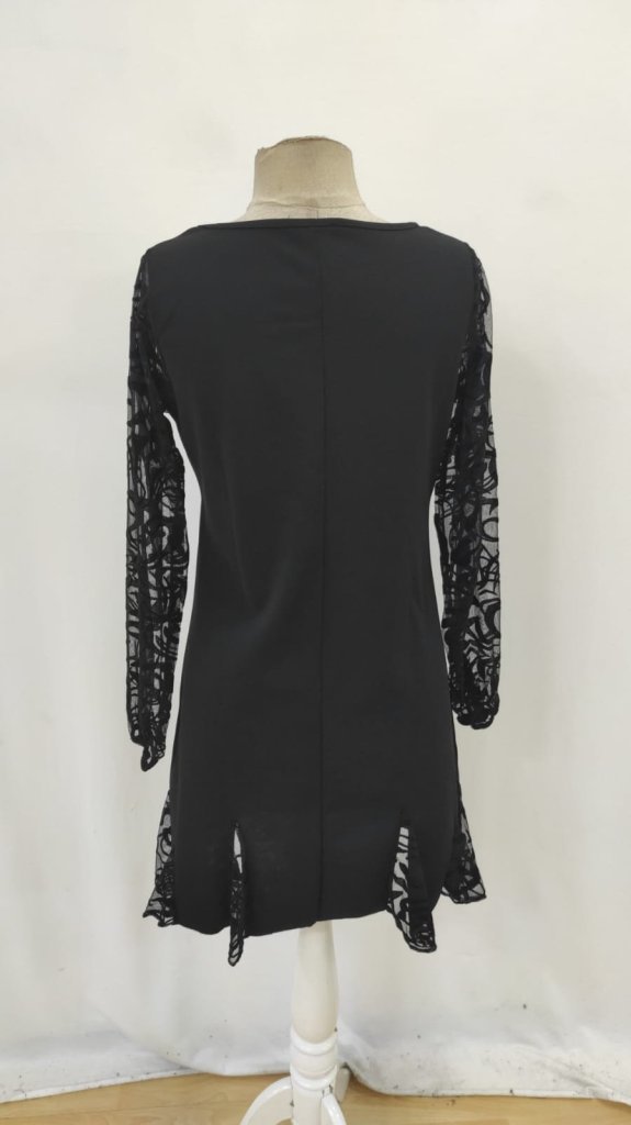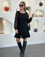 Kadın Uzun Kollu Yuvarlak Yaka Kol Ve Etek Ucu Dantelli Kısa Ithal Krep Elbise
