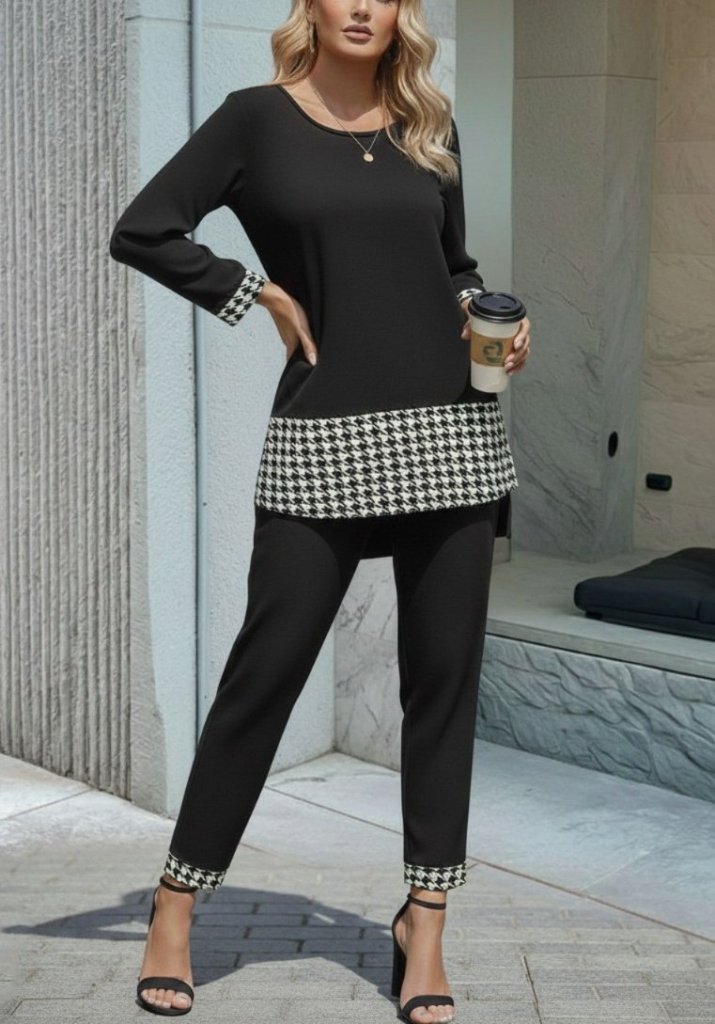 Kadın Uzun Kollu Yuvarlak Yakalı Kaz Ayağı Detaylı Viskon Iki Iplik Bluz Ve Pantolon Ikili Takım