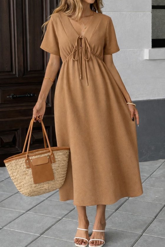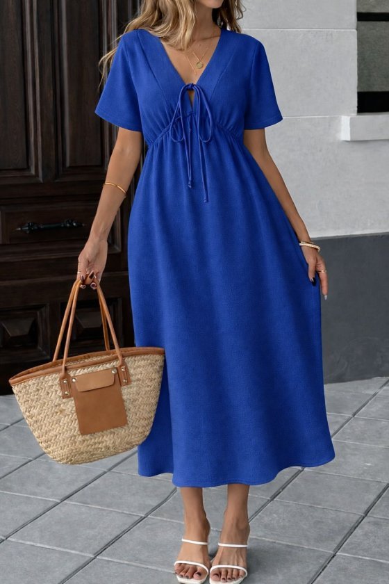 Kadın V Yaka Büzgülü Ip Detay Aerobin Kumaş Elbise