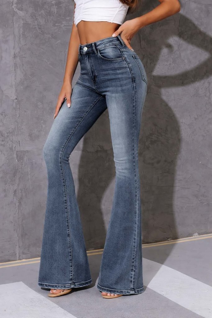 Kadın Yüksek Bel Fermuarlı İspanyol Paçalı Kot Pantolon